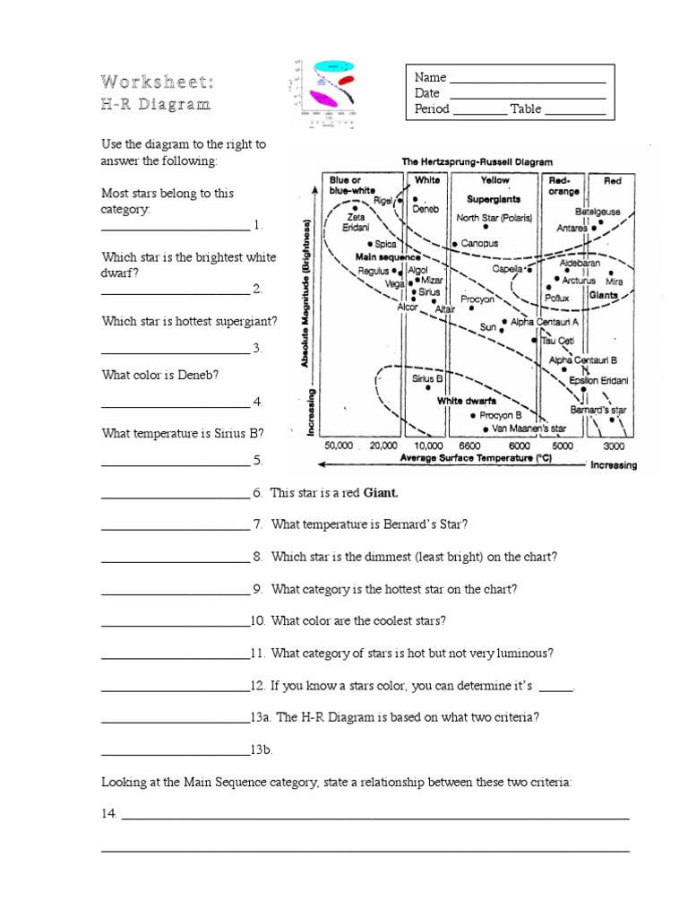 HR DIAGRAM ACTIVITY. NAME _____ DATE _____ HOUR ___ The Hertzsprug- Russel diagram (H-R) is a graph where a star’s temperature is plotted against its brightness. From this diagram you can determine star properties as well as its life stage. Purpose. To classify stars. ... Q. The H-R Diagram classifies stars based on what two criteria? answer choices . Brightness and temperature. Brightness and age. Temperature and hobbies. Temperature and color. Tags: Question 16 . SURVEY . 30 seconds . Q. Looking at the Main Sequence category, state a relationship between brightness and temperature. When we talk about Hertzsprung-Russell Diagram Worksheet Answer Key, below we can see various similar photos to inform you more. stars and the hr diagram worksheet answer key, hr diagram worksheet and hr diagram worksheet answers are three of main things we want to show you based on the post title.