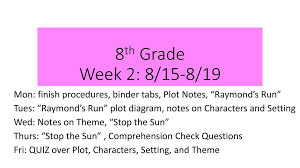 8th Grade Week 2: 8/15-8/19 Mon: finish procedures, binder tabs, Plot Notes, “Raymond's Run” Tues: “Raymond's Run” plot diagram, notes on Characters and. - ppt download