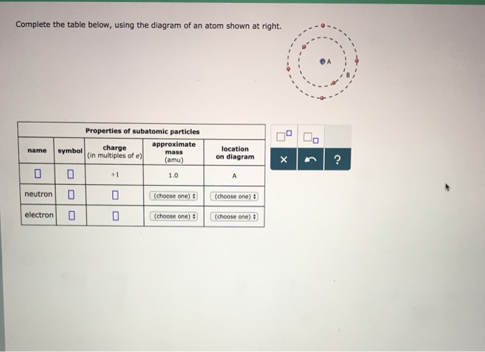 Complete the table below using the diagram of an atom shown at right. 10152016 atoms ions and molecules identifying the parts of an atom complete the table below using the diagram of an atom shown at right. 0 properties of subatomic particles approximate name symbo in multiples of e location on diagram amu choose one choose one 10 0 10.