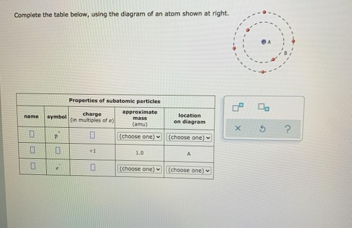 Complete the table below, using the diagram of an atom shown at right. A name Properties of subatomic particles Aharge approximate symbol mass (in multiples of e) (amu) name location on diagram X5 ? O 1.0 А 0 1.0 А proton (choose one) (choose one) Complete the table below, using the diagram of an atom shown at right.