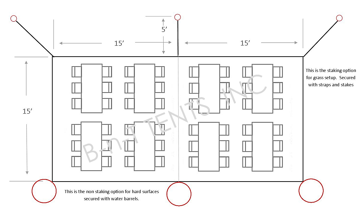 One of our tent specialists will help you design a tent floorplan and provide you with a diagram so you can see exactly how your event will look. . Browse through our tent table layout ideas to find one to suit your specific occasion. 20 x 20 TENT. 6 eight foot banquet style tables with 8 chairs at each.