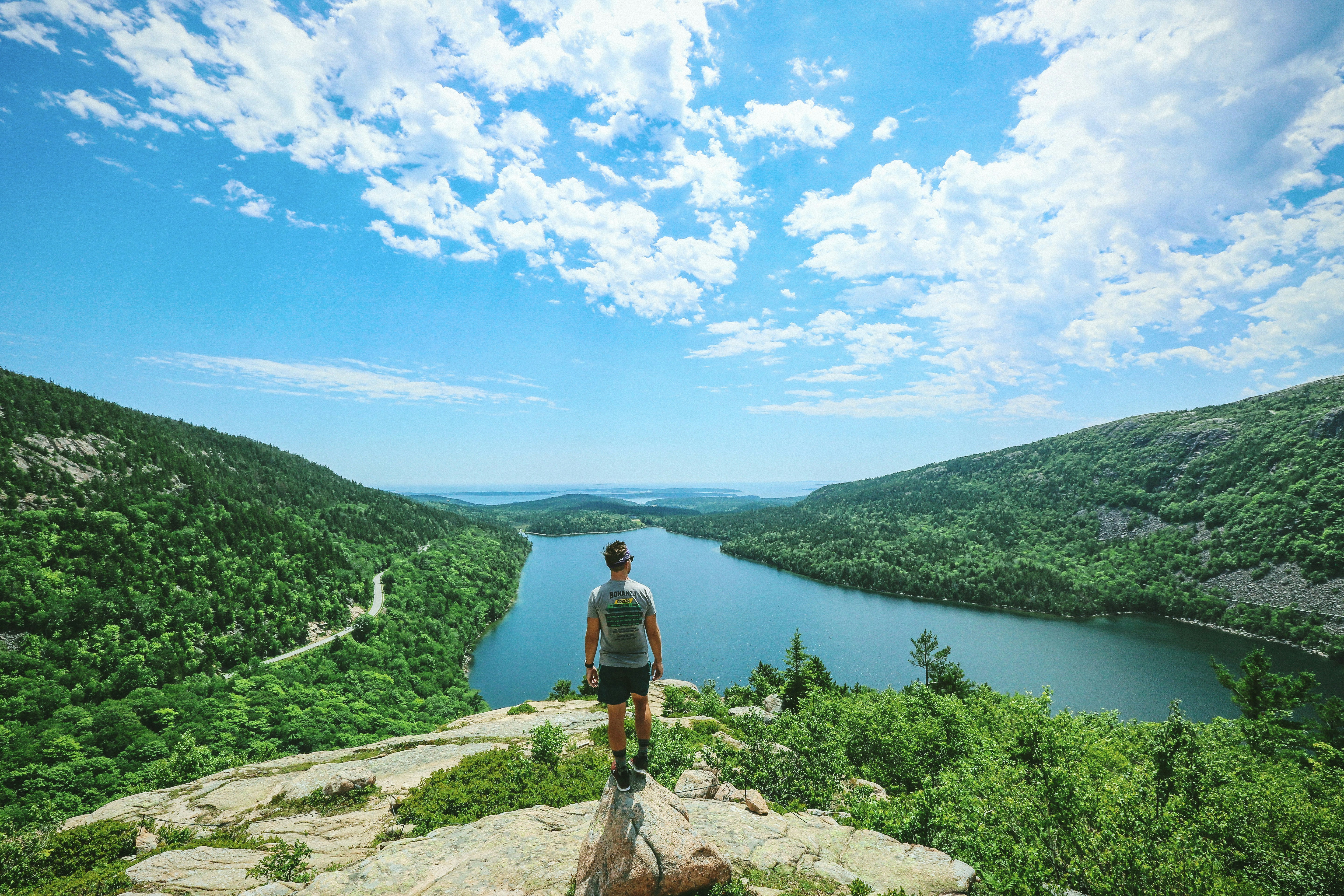 A family hike up the South Bubble of Acadia National Park. I thought we were just going to Bubble Rock, but the view south toward Jordan Pond and the islands beyond was outstanding. I love the full image of clouds, forest, lake and person taking it all in.