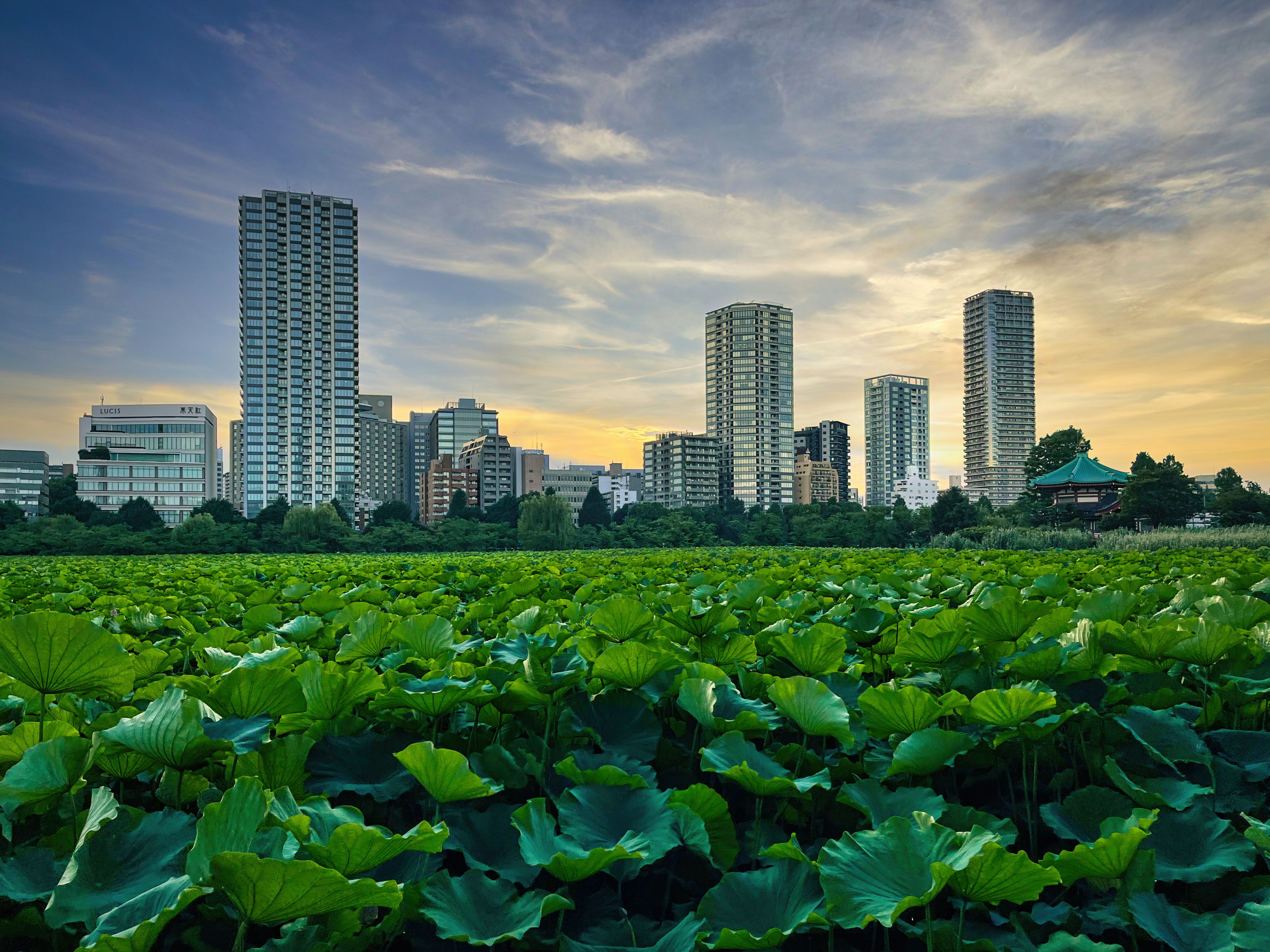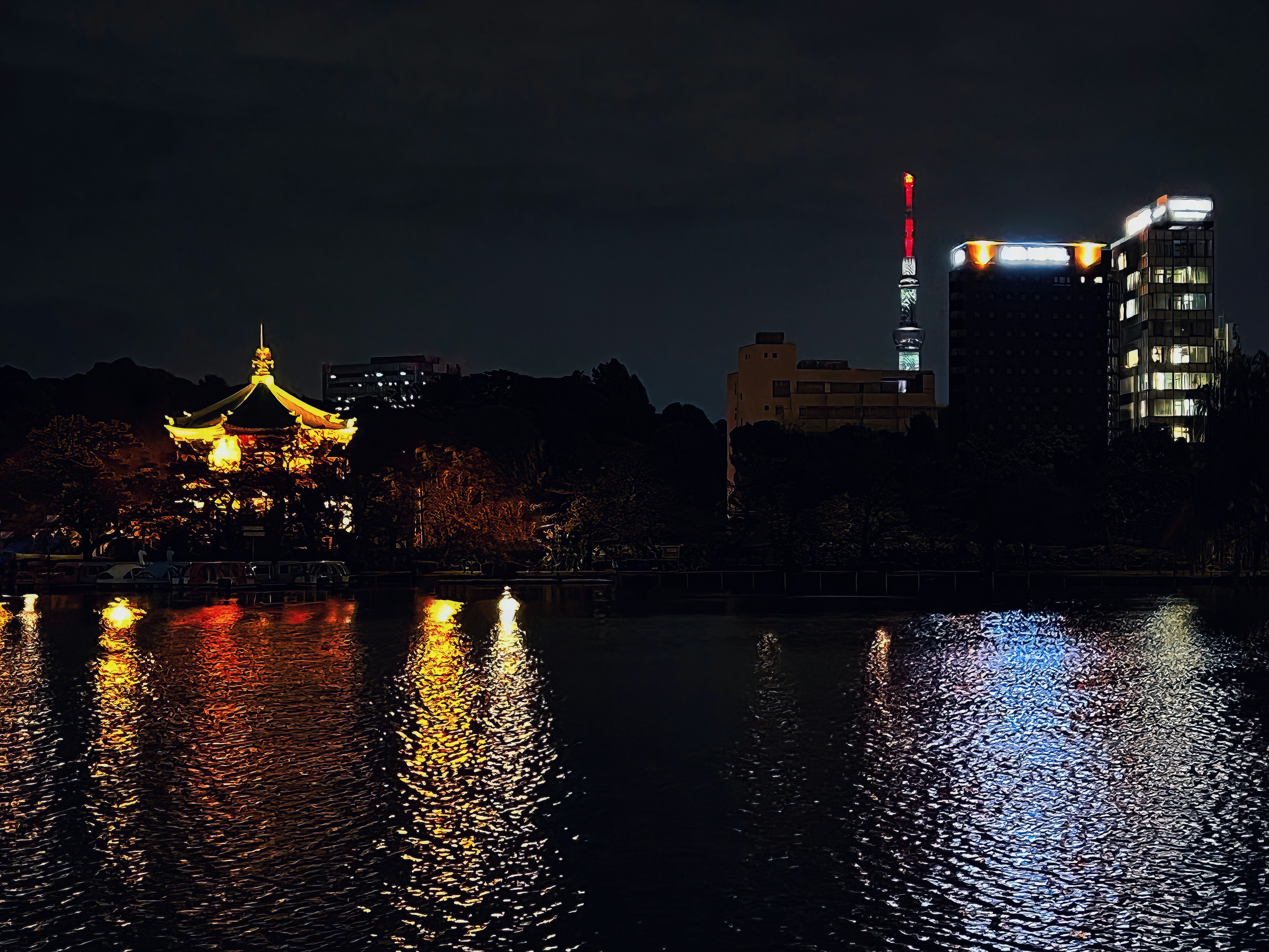 Bentendo temple and apartment tower lights are reflected on the water at night, Shinobazu Pond, Ueno Park, Taito City, Tokyo, Japan.