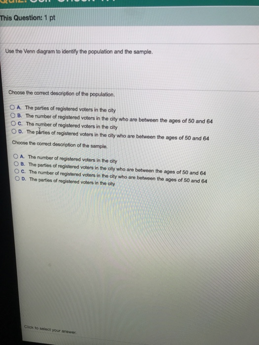 Use the venn diagram to identify the population and the sample. Use the Venn diagram to identify the population and the sample. A rectangular box reads, The income of home owners in a certain state, contains a smaller ... Rating: 4 · 4 reviews 10/01/2020 · A marketer, for example, might use the design to compare a population by income, weight or IQ, in which the smallest groups will often be at both the top and bottom. Regardless, the graph clearly depicts population trends, while it compares the sizes of two related groups. Spider Charts. Create your own charts and graphs with Visme! Try It For Free. When a … FREE Answer to Use the Venn diagram to identify the population and the sample voters in a certam region...1 answer · 0 votes: Since the venn diagram is showing the population as the parties of registered voters in a certain region therefore option C is correct as parties of registered ... 6 Use the Venn diagram to identify the population and the sample A rectangular from MAT 200 at Georgia Military College.
