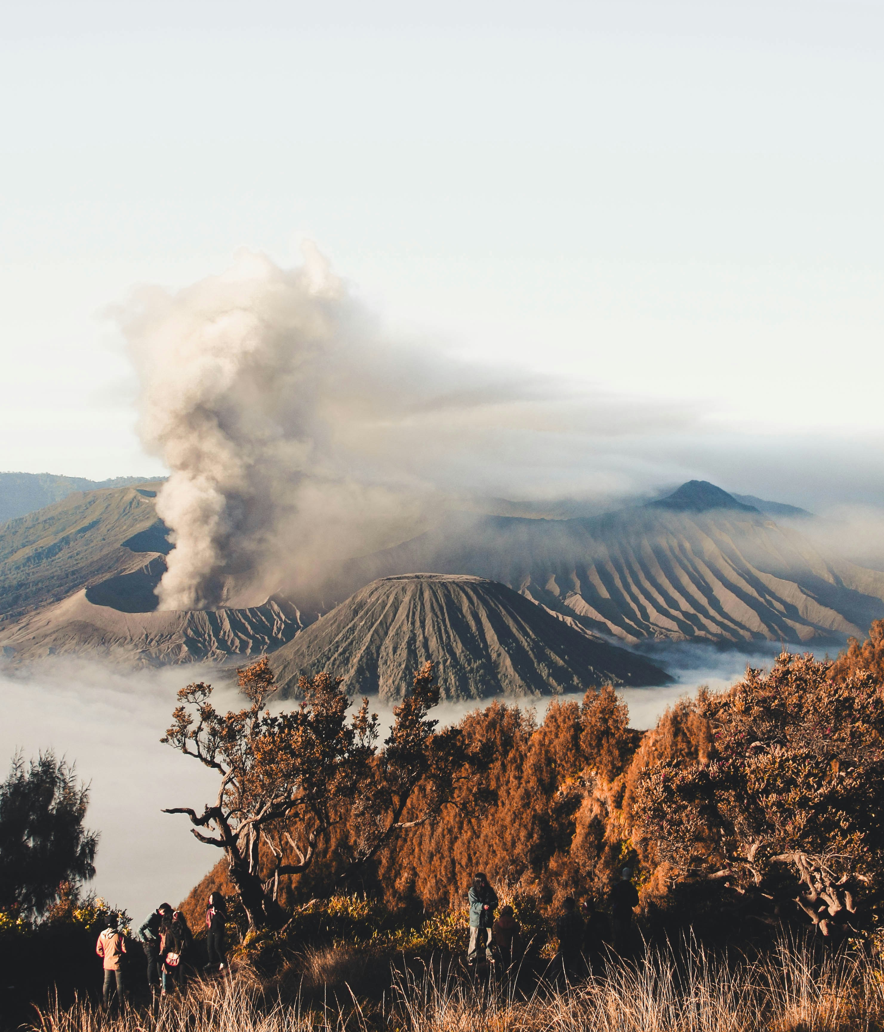 Forest of lava trees resulting from eruption of a 1-km-line of vents east of Pu'u Kahaulea on Hawai'i Island's Kilauea Volcano. The bulbous top of each lava tree marks the high stand of the lava flow as it spread through the trees. As the fissure eruption waned, the flow continued to spread laterally; its surface subsided, leaving pillars of lava that had chilled against tree trunks. Spattering is from fissure out of view to the left. Note blob of spatter adhering to the top of the stripped 'ohi'a tree.