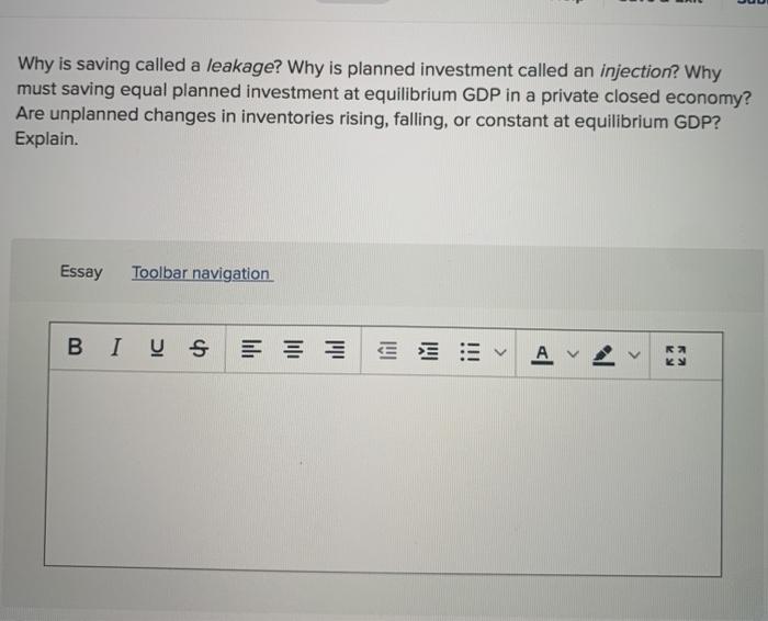 Refer to the diagram for a private closed economy. the equilibrium level of gdp is. › the-economy › bookUnit 17 The Great Depression, golden age, and global ... - CORE Refer to Figure 17.20 and assume the economy is closed. Question 17.11 Choose the correct answer(s) Figure 17.26 depicts the US aggregate demand between 2006 Q2 and 2010 Q4. ECON 2 Flashcards | Quizlet The equilibrium level of GDP is $300 Refer to the diagram, which applies to a private closed economy. If aggregate expenditures are C + Ig2, the amount of saving at income level J is KN Other things equal, the slope of the aggregate expenditures schedule will increase as a result of an increase in mpc Macroeconomics Unit 2 Exam Flashcards | Quizlet Refer to the diagram, in which T is tax revenues and G is government expenditures. All figures are in billions. The equilibrium level of GDP in this economy a. is less than $400. b. is greater than $400. c. is $400. d. cannot be determined from the information given. PDF Part A Multiple-Choice Questions [20 marks] - Queen's U 17. Refer to the above diagram which applies to a private closed economy. If gross investment is I g1, the equilibrium GDP and the level of consumption will be: A) H and HB respectively. B) J and JI respectively. C) J and JK respectively D) H and HF respectively. 18. Refer to the above diagram which applies to a private closed economy. If gross