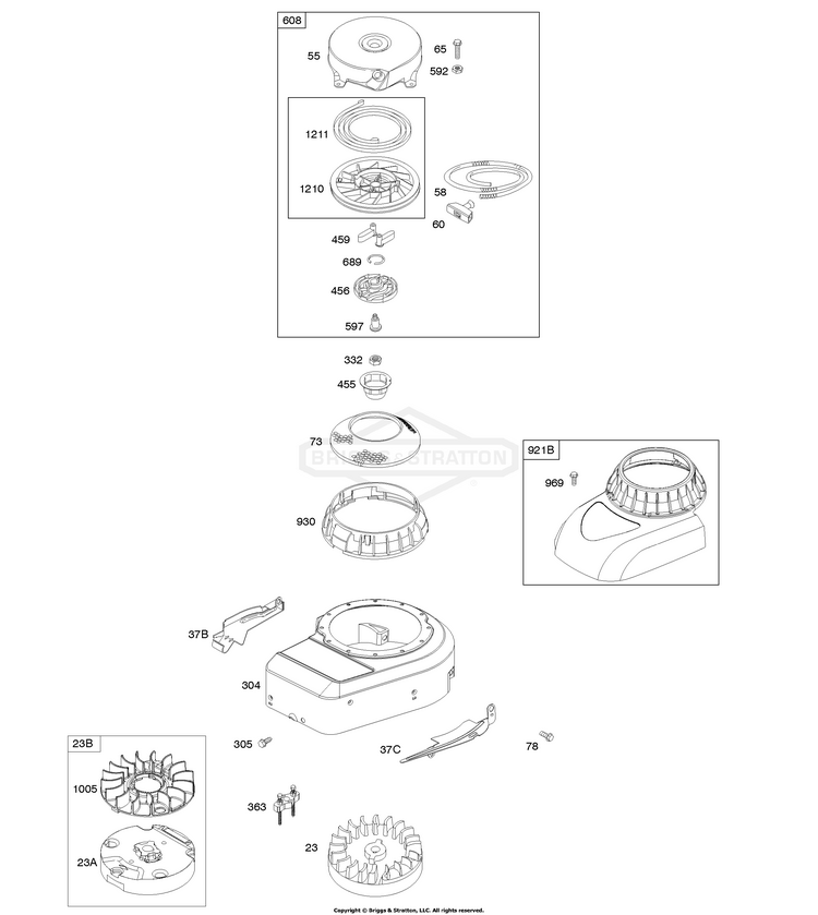 Briggs and Stratton Recoil Starters - Lawnmower Pros Briggs and Stratton Illustrated Parts Diagrams. 4 Products Found. Briggs And Stratton 497598 Recoil Starter Rewind Assembly Genuine OEM Briggs and Stratton Part Includes starter cup to use on engines with Susa starters, debris screen, mounting hardware. THIS PART REPLACES: