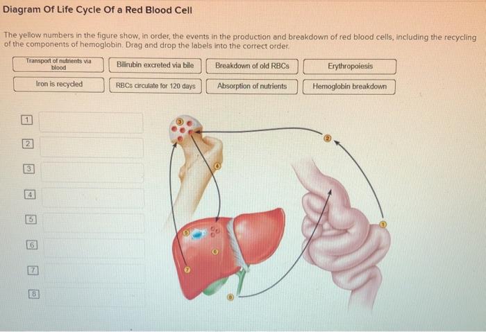 Solved Diagram Of Life Cycle of a Red Blood Cell The ... diagram of life cycle of a red blood cell the yellow numbers in the figure show, in order, the events in the production and breakdown of red blood cells, including the recycling of the components of hemoglobin drag and drop the labels into the correct order transport of nutrients via bilirubin excreted via bile breakdown of old rbcs …