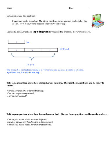 43 tape diagram for multiplication Multiplication: Skip Counting with Vertical Tape Diagrams & Number Sentences is a Google Slideshow on how tape diagrams relate to multiplication (and division).I have the 49 slides in this Google Slide deck that "skip counts" each factor 1-12 by four.Here is a video on how I use this with the st A tape diagram is a rectangular drawing that appears like a tape piece with divisions to support ... Tape Diagram Multiplication Worksheet | Maths Worksheets To Do Tape diagrams also called bar models help students see. Tape Diagram Multiplication WORD PROBLEM Task Cards Set 2Please see the preview. Ad Includes all topics. For example they will use a tape diagram to think of 5 times two-thirds not only as 5 groups of two-thirds but as the result of an amount 5 x 2 3.