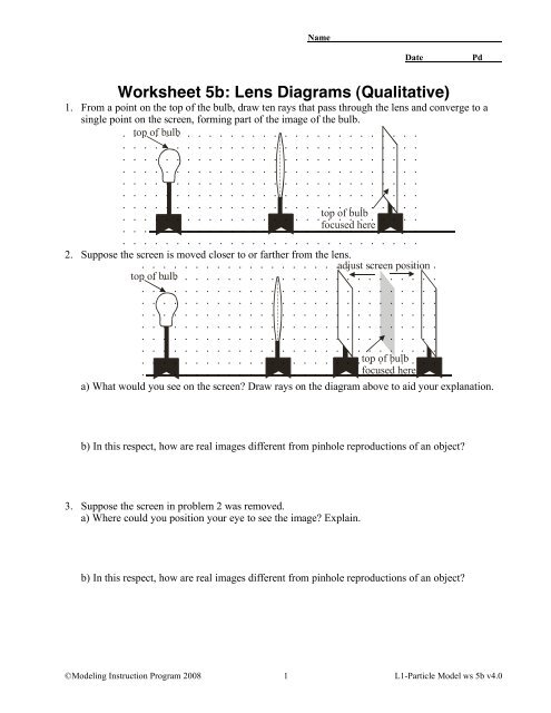 Physics 152 Diverging & Converging LENS Worksheet The ... Physics 152 Diverging & Converging LENS Worksheet The same object (height = y) is placed at several different distances s to the left of the same lens (focal length = f). For each case, draw the 3 principal rays to locate the image. Then use the "thin lens" equations to calculate: Lens Diagram Worksheet The Physics Classroom, 2009. Lens Diagram Worksheet. For each case below draw a ray diagram. Draw the image as an arrow and give a description of the image.4 pages Refraction Ray DIagram worksheet ID: 2295499 Language: English School subject: Physics Grade/level: Grade 8 Age: 8-16 Main content: Light and Optics Other contents: Refraction of Light Add to my workbooks (4) Embed in my website or blog Add to Google Classroom PDF Converging and diverging lenses ray diagrams worksheet ... Converging and diverging lenses ray diagrams worksheet answers pdf The image formed by a single lens can be located and sized with three principal rays. Examples are given for converging and diverging lenses and for the cases where the object is inside and outside the principal focal length.