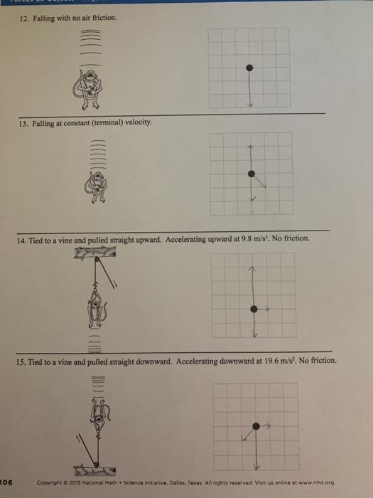 A ball is falling at terminal velocity. Which free body ... A ball is falling at terminal velocity. Which free body diagram shows the ball falling at termainal velocity 2 See answers Advertisement Advertisement Heyitsdaedae Heyitsdaedae so I hope that diagram gives u a great view at it Advertisement Advertisement nessa314 nessa314 Hey guys! I just took the quiz and the correct answer is the picture below! A ball is falling at terminal velocity. Terminal velocity ... Explanation: This is because at terminal velocity, the ball stops accelerating and the net force on the ball is zero. For the net force to be zero, equal and opposite forces must act on the ball, so that their resultant force is zero. That is F₁ + F₂ = 0 ⇒ F₁ = -F₂ Since F₁ = 20 N, then F₂ = -F₁ = -20 N 5.7 Drawing Free-Body Diagrams - General Physics Using ... Draw a free-body diagram for each block. Solution Significance Each block accelerates (notice the labels shown for →a 1 a → 1 and →a 2 a → 2 ); however, assuming the string remains taut, they accelerate at the same rate. Thus, we have →a 1 = →a 2 a → 1 = a → 2. PDF Free-Body Diagrams - Ms. Poulton's Science & Math Class ... Construct free-body diagrams for the following physical situations. Label all forces (e.g, Fgrav, Fnorm, Fapp, Ffrict, Fair, Ftens, etc. ). a. A physics book rests upon a level table. b. A skydiver is falling and has reached a terminal velocity. c. A large crate is being pushed leftward at a constant velocity. d. A sledder has reached